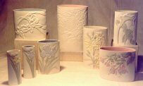 This rather obscure SBCD line of pottery was inspired by a visit Ray and I paid to Bloomingdale�s in New York in 1982-3. He spotted the Rosenthal display of detailed abstract designs, carved into vases and cast in a Parian-ware body. Ray put his twist on the idea and created the �Florescence� line - a very functional, all-white selection of vases with floral designs. It expanded our retail reach, selling for only $18 - $48.